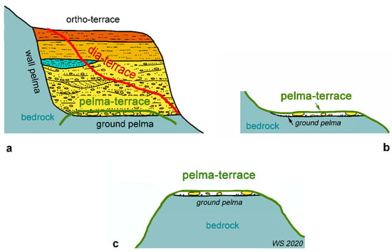 Pelma-terrace: a complete flument (a) eroded down (green line) to the basal facies leaving only the lag layer and the ground pelma (contact of the basal facies with the bedrock), (b) with a backwall, (c) crowning a hilltop. Normally, the pelma-terrace deposit is a loose litter of pebbles.