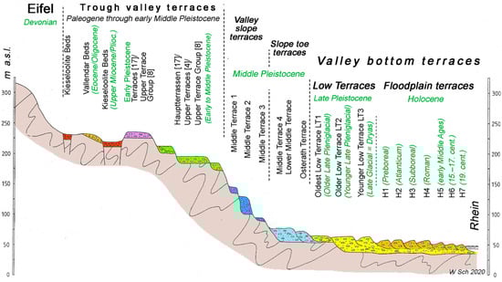 Scheme: Flument/terrace flight of the Middle Rhine River within the Rhenish Shield. Eifel = mountains adjoining the Rhine valley to the west. Vertical scale exaggerated. Location: The uplifted Rhenish Shield (violet area in Figure 1).