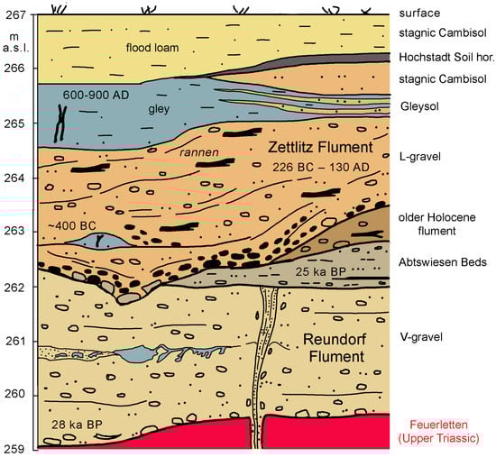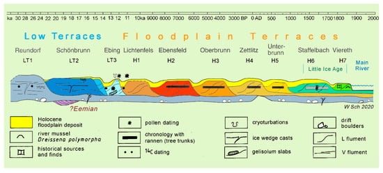 In the case of the missing incision of a river and continuing rhythmical formation of fluvial deposits, fluments and terraces can form a lateral row, called, respectively, row fluments and row terraces [] (pp. 12, 28). There are a lot of papers dealing with row terraces, e.g., [,]. Herein, the terraces lie side by side, at least with its surfaces on the same level. Mostly, though, the flument bases also hold a similar level, which is the case among the Holocene floodplain fluments. Moreover, each of the younger fluments can form nested fluments within the terrace row (Figure 9). Separation of the individual fluments is possible morphologically by their floodplain edge channels, pedologically by their floodplain soils, and chronologically by their age. The amount of Holocene fluments within the terrace row at the valley bottom is rather constant in Central Europe [,].
