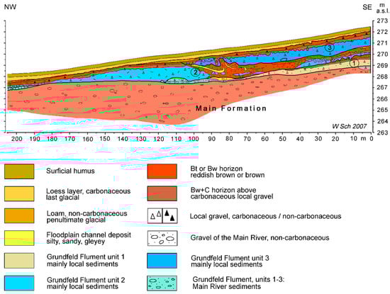 The fluvial stack of the Main River (Figure 7), dating to roughly 1–0.5 Ma [], seems to grow up rather continuously. However, each break between the six preserved fluments shows a hiatus, indicating a standstill with soil formation and certain erosion. Concerning the glacial history, these hiatuses indicate the climatic change between glacial and interglacial periods, including the transitional period between both. Actually, during these transitional periods the bulk of erosion and a great deal of the accumulation happened.