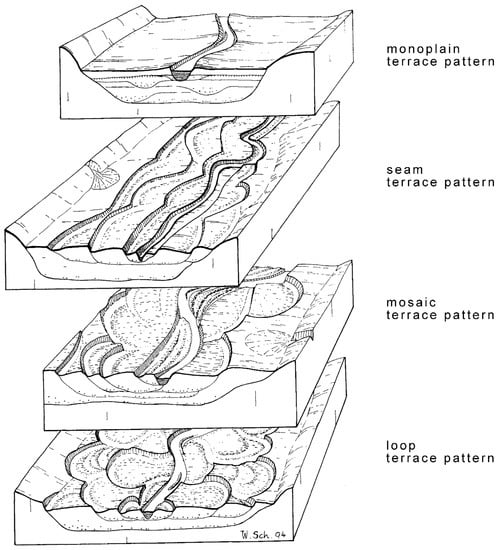 The lowest surface of the valley is called the valley bottom. The valley fill beneath is called the valley underground. The terrace pattern (Figure 15) is the configuration of the nowadays preserved fluments of the valley bottom. The four main terrace patterns (surface patterns) are recognized as occurring frequently along most rivers in Central Europe and other areas, e.g., [,,,]. Naturally, those patterns also existed during all former interglacials. However, these former interglacial periods are preserved by their fluments only and not by their terraces.