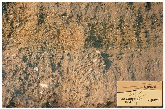 The inner structure of the flument simplified shows two main sedimentary types, the vertical aggradation type and the lateral accretion type (Figure 2)—though it must be remarked that these sedimentary types are two of many possibilities. The first type mostly results from braided reaches, the latter from the meandering parts within a river course. A flument of the lateral accretion type is called L-flument (according to Lateral), that of the vertical aggradation type, V-flument (according to Vertical) [] (p. 25). The L-flument at its base is characterized by skeleton gravel (open work gravel).