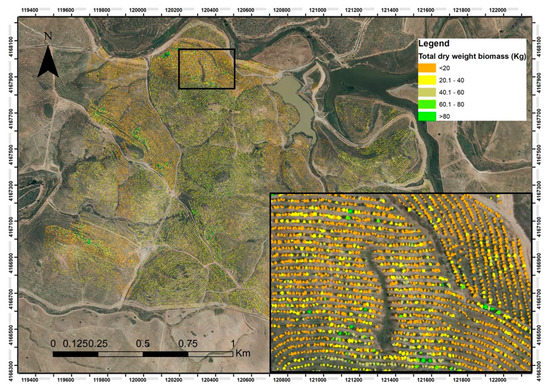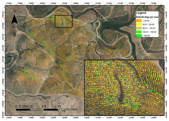Finally, a C stock map of the holm-cork oak cover in the study area was generated. The models obtained in Section 2.5 were used to calculate H from the ALS metrics at the tree scale (250 ha, 51,093 trees). Once the H of each tree had been calculated, the allometric models considering H as an independent variable were applied to determine Wt-S and SOC40-S.