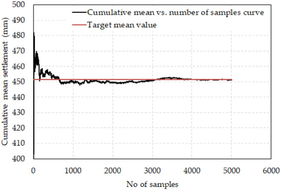 Figure 4 presents the number of simulated samples for the settlement of Karakore soft soil on the 310 days of observation. In the MC simulation technique for random variables converged at 4000 number of samples. This indicated that increasing the number of simulations beyond 4000 samples did not affect the probabilistic distribution of the population data and did not bring significant change to the outcome of the dataset. The simulation of random samples was assessed for random model inputs, settlement outputs, and settlement ratio. From Figure 4, the minimum sample size for the random variable to reach an acceptable accuracy was found to be 4000. This random sample number agreed well with the recommendation made by Phoon (2015) for MC simulations [46].