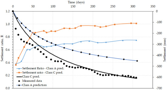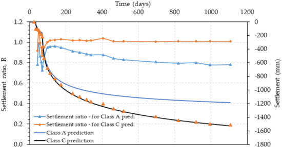 For Ballina clay (Figure 6), generally, Class A also under-predicted the field settlement of the estuarine clay. But, during the early period of observation (during the loading phase), the predictions matched well with the field measured settlements and the average R values were closer to 1. During these early periods of observation, stiffness and consolidation model parameters had a lesser influence on the settlement response. The applied embankment load was the major contributing factor for the deformation. This supported the finding reported by Liu et al. [42] that pre-overburden pressure (POP) was the most influencing random variable on the predicted settlement during the period of embankment loading. Besides, at the end of filling, the plastic deformation (shear yielding) was the dominant settlement than the consolidation settlement in which the applied load exceeded POP Chan et al. [32]. However, beyond 98 days, Class A approach under-predicted the field settlement. The corresponding average R was found to be 0.87 for Ballina clay.