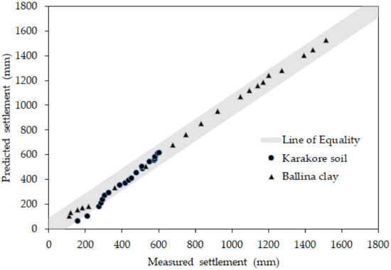In general, Class C predicted the behavior of the field settlement behavior of Ballina clay much better than it did for Karakore clay. The distribution of Ballina soil profile is relatively uniform, the laboratory tests and field monitoring were controlled and well established than Karakore. Figure 7 depicts the relationship between Class C predicted and field measured settlements of Karakore and Ballina sites. For Karakore area, it can be seen that the points scattered about the line of equality, indicating that during the earlier observation periods, the prediction underestimated settlements, but later the predicted and measured values agreed well; whereas for Ballina, the field measured and PLAXIS 2D model predicted settlements fitted well to the line of equality.