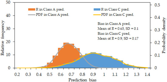 Distribution of settlement prediction bias for average values of R from Class A and Class C—Ballina clay.