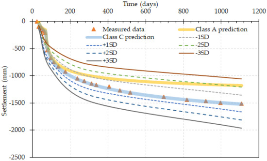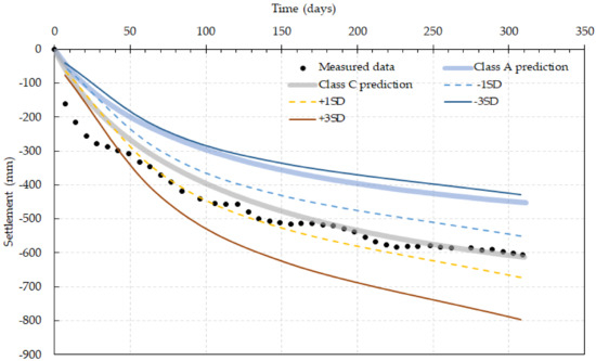 From Figure 11 and Figure 12, Class A prediction of Karakore and Ballina was found to be close to the best estimate of mean—3SD and mean—2SD, respectively. The predicted settlement of Karakore clay using the laboratory input parameters at the end of observation was found to be 428.4 mm as LB values, whereas the UP was 795.6 mm. This shows that the prediction was found within a 99.73% confidence interval of all values. Whereas, Ballina clay, the LB predicted value was 1209.2 mm, whereas the UB was 1814.4 mm, which is all values laid within a 95% confidence interval.