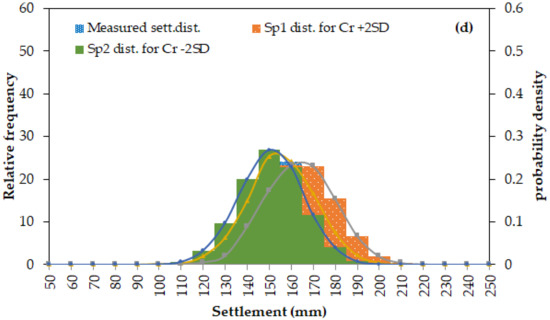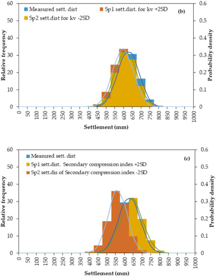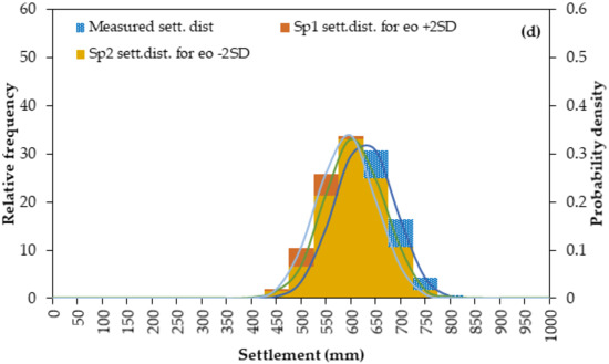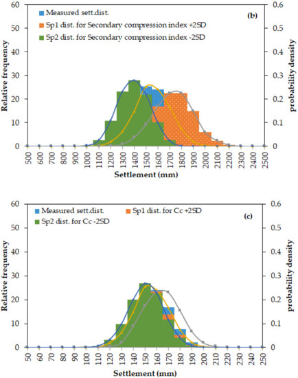 This section presents and discusses the effects of variation of input parameters on settlement distribution. Influences of input parameters on the output distribution of settlements were evaluated for both Karakore and Ballina clay. To assess the impact of input parameters on the distribution of settlements, an uncertainty analysis was executed for Class C prediction. The settlement distribution was performed by varying the most influencing compression and consolidation parameters namely Cc, and Cα, eo and kv plus and minus two SD. It led to the settlement distribution of Sp1 (settlement for mean of a parameter +2SD) and Sp2 (settlement for mean of a parameter −2SD) and presented in Figure 12, and Figure 13. To compute the settlement distributions, a reasonable CoV of 0.15 for Karakore field monitoring and 0.1 value of CoV for Ballina [31] were used for the settlement measurement error. Then, the mean and SD were computed from the generated probabilistic settlement distribution.