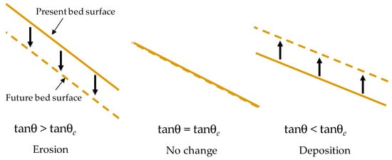 where θx is the bed slope in the x direction and θy is the bed slope in the y direction, and θe is the equilibrium bed slope. Figure 1 shows the relationship between bed deformation and bed slope. When the bed slope is steeper than the equilibrium bed slope, the bed surface is eroded, and the eroded materials are introduced into the debris flow. When the bed slope is equal to the equilibrium bed slope, the bed surface is not deformed, and the mass of the debris flow is unchanged. When the bed slope is milder than the equilibrium bed slope, the materials in the debris flow are deposited on the bed and the mass of the debris flow is reduced.