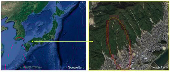 As shown in Figure 3, Asaminami is located in the northern Hiroshima City. The average land slope is 20 degrees. Figure 4 presents the geological map around Asaminami. The red circle in Figure 3 and Figure 4 indicates the research area. The geology around Asaminami is mapped as granite and accretionary prism. However, most parts of the land surface are covered by granite, based on our field observations. The residential area is located at the foot of a slope, and 41 casualties resulted from debris flows.