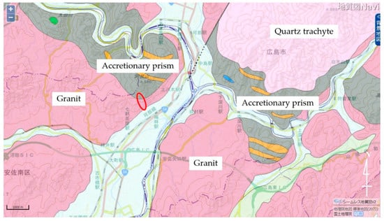 Geological map of the area around Asaminami, Hiroshima, Japan (Souce: The National Institute of Advanced Industrial Science and Technology, Japan). The red circle indicates the research area.