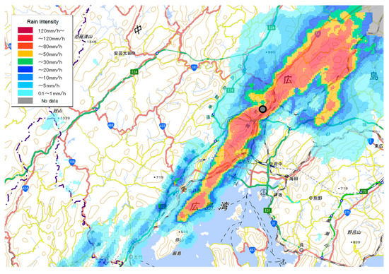 Horizontal distribution of rain intensity at 03:00 on August 20, 2014 (Source: Japanese Ministry of Land, Infrastructure, Transport and Tourism). The black circle indicates the location of Asaminami, Hiroshima.