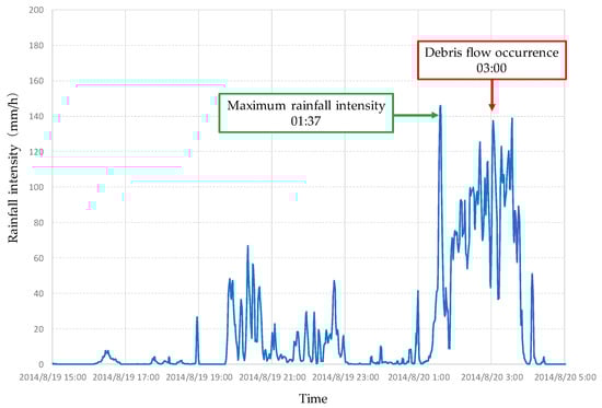 Temporal change of rainfall intensity at Asaminami, Hiroshima (Data source: Japanese Ministry of Land, Infrastructure, Transport and Tourism).