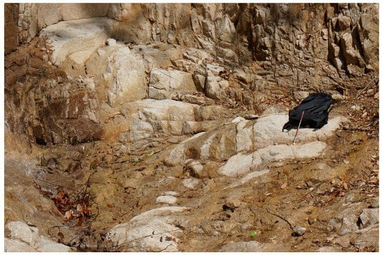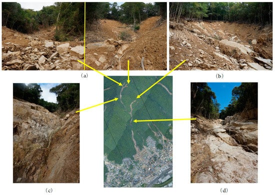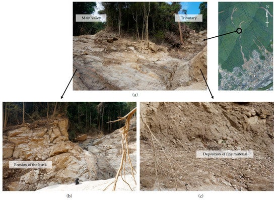 Figure 10 shows the confluence of the main valley and the tributary, and photo (b) shows the right bank (on the western side of the valley) at the confluence having been eroded by the debris flow from the tributary, and exposing the base rock. Contrastingly, the left bank (the eastern side of the valley) at the confluence was eroded by a debris flow from upstream of the main valley, but the land surface is covered by fine grained granite after the disaster (Figure 10c). This indicates that the last debris flow was from the tributary, and fine-grained granite from the tributary was deposited on the left, inner bank (the eastern side).
