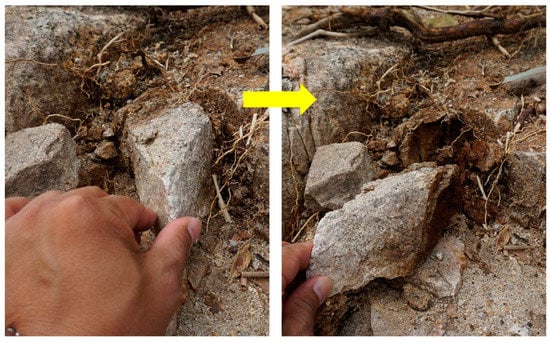 Figure 7 shows the slope eroded by the surface landslides in the (a) main valley and (b) tributary, and (c) and (d) the beds eroded by the transportation of debris and water flows. At least three debris flows occurred. They started from (a) the upstream end of the main valley, (b) the upstream end of the tributary, and (d) the midstream area of the main channel. Photo (c) in Figure 7 shows a high step in the valley bed, and many other steps were observed in the valley. The slope surface is composed of well weathered granite, which can be easily broken by hand, as shown in Figure 8. The permeability in the granite is very high because many joints are formed as shown in Figure 9. Hence, the slope failures do not occur as a result of a high level of accumulated precipitation with low rainfall intensity; the failures of the surface slope occurred because of high rainfall intensity.