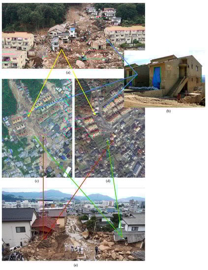 Damaged houses in the residential area, Asaminami, Hiroshima. (a) and (e), which were taken by Luce Search Inc., show damaged houses. (b) shows reinforced concrete buildings with small damages. (c), which was taken by Japanese Ministry of Land, Infrastructure, Transport and Tourism, is an aerial image after the disaster. (d), which is from Google Earth, is an aerial image before the disaster.
