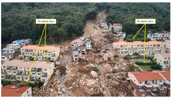 Figure 11 shows the damaged residential area. Three-storied reinforced concrete buildings, shown in (b), and wooden houses are located at the downstream end of the valley. While many of the wooded houses located along the road collapsed, all the reinforced concrete buildings remained intact despite being in the path of the debris flows. Even though the glass windows of the reinforced concrete buildings were broken, and sediment flowed into the first-floor rooms, damage to the reinforced concrete buildings was minor. Figure 12 shows the no-inundation areas of the debris flow. Because of the existence of the reinforced concrete buildings, the debris flows were concentrated along north–south roads and did not spread in the east-west direction.