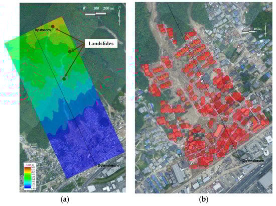 Two analysis cases were performed. For Case 1, the houses and buildings left after the disaster as shown in Figure 13b were considered. For Case 2, the houses and buildings were neglected. Houses and buildings were treated as non-permeable non-destructive structures and behave as obstacles.