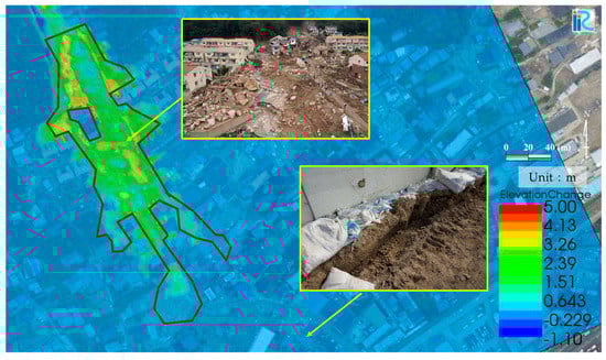 Figure 14 shows the horizontal distribution of the land deformation thickness in the residential area obtained by the numerical analysis of Case 1. The brown line indicates the region where large rocks and driftwoods were deposited. As shown in the photos in Figure 14, sediment sorting was observed in the residential area. Large rocks and driftwoods were observed near the exit of the valley and many wooden houses were seriously damaged. However, only fine-grained granite was deposited downstream of the residential area. As shown in Figure 14, the land deformation area is in good agreement with the deposition area of the large rocks and driftwoods. This model was developed to reproduce the development, transportation, and deposition processes of the debris flow; the erosion, transportation, and deposition of fine-grained sediment after the deposition of sediment transported as a debris flow was not considered. As shown in Figure 6, the rainfall intensity was high after the sediment transported by the debris flows was deposited. Hence, the deposited sediment in the residential region was eroded by the heavy rain and the only fine-grained material was transported downstream. Therefore, the two-layer model based on Equations (4) and (5) did reproduce the debris flow land deformation region.