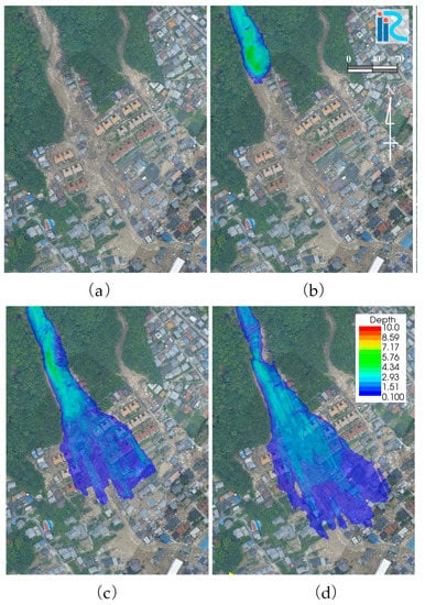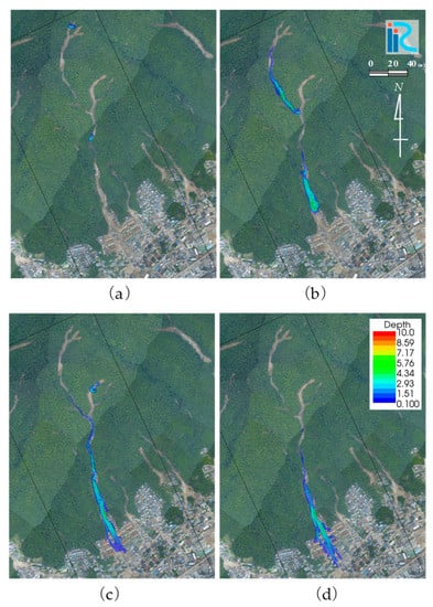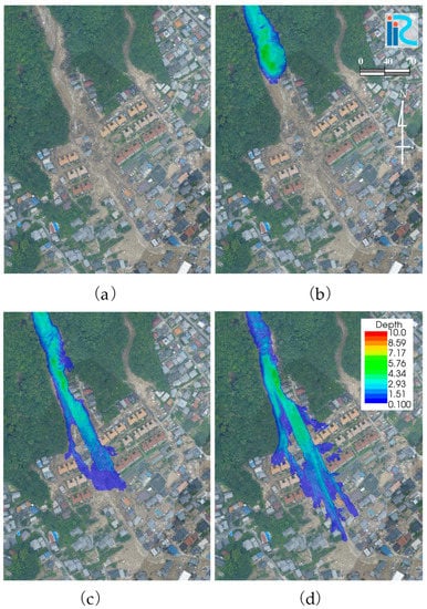 Case 2: Spatiotemporal change in debris flow depth in the residential area. Houses and buildings were not considered in this analysis. (a), (b), (c), and (d) show the flow depth at 5 s, 43 s, 105 s, and 200 s, respectively.
