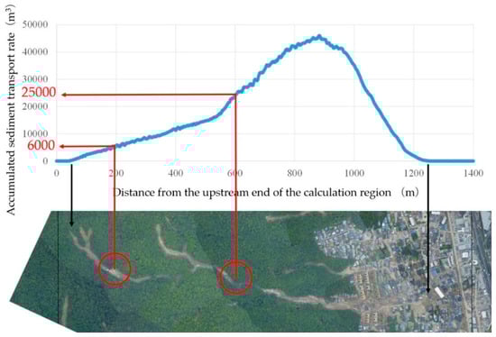 Numerical simulation of debris flows can be a also useful tool in taking hard countermeasures against sediment disasters. Figure 18 shows the longitudinal distribution of the temporally accumulated sediment transport rate, which increased up to 880 m away from the upstream end of the calculation region. This reduced after 880 m due to deposition. The dense residential area was located 1008 m from the upstream end of the calculation region, and the temporally accumulated sediment transport rate was 33,504 m3, which is in good agreement with the measured value of 33,000 m3 from the DEM data obtained by the Japanese Ministry of Land, Infrastructure, Transport, and Tourism. The longitudinal distribution of the temporally accumulated sediment transport rate is very useful for the design and locating of check dams. If accessible, a check dam could be constructed in the upstream region at 200 m; a small check dam or a steel net as shown in Figure 19a able to deposit 6000 m3 would be sufficient. Locating a check dam at 600 m that would deposit sediment from both the main valley and the tributary able to deposit 25,000 m3 would also be sufficient.