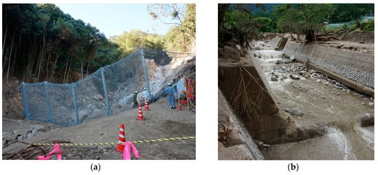 Examples of hard countermeasures of sediment disasters. (a) Steel net for capturing small debris flow, (b) Channel work.