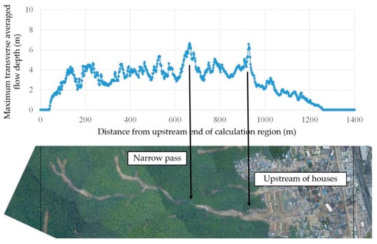 To design each check dam, the deepest flow depth and the maximum flow velocity at each location would be the most useful information. These values are very affected by the geometry of the land upstream of the check dams. Figure 20 shows the longitudinal distribution of the deepest flow depth of each cross-section, and as Figure 18 shows, the temporally accumulated sediment transport rate increased up to 880 m from the upstream end of the calculation area. However, the flow depth did not substantially increase from 100 m onwards, only changing from 2 to 7 m (Figure 20), and started to decrease from 900 m because of deposition. The steps shown in Figure 7c suppress the development of flow depth. Figure 21 shows the temporal change in the flow depth upstream of the main valley. There are several steps up to 10 m high in this reach, and, as shown in Figure 2, the flow depth is shallower at the steps and deeper upstream of the steps and the flow velocity is faster at the steps and slower upstream of steps. As a result, the debris flow is extended along the flow direction around the step, and the flow depth cannot be much deeper because of the extensions. In the analysis, fine numerical grids were used to reproduce the shape of the steps in valley rock bed. Therefore, high resolution elevation data and fine numerical grids are needed to reproduce the shape of steps when calculating deepest flow depth and maximum flow velocity.