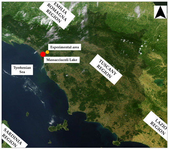 Location of the experimental area (indicated by the yellow filled circle), in hydraulic connection with the adjacent Massacciucoli Lake (indicated by the red filled circle). (From https://www.esa.int/ESA_Multimedia/Images/2010/07/La_Toscana_vista_da_Envisat, modified).