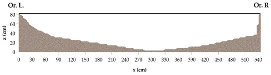 The field hydrodynamic experiments inside the 70-m long experimental channel stretch were carried out with six different flow rates. In this study, we examine just the two flow rates that were established under the condition of partial riparian vegetation cover. Following Errico et al. [1], hereinafter these two flow rates are respectively referred to as Q2 = 0.16 m3·s−1 and Q3 = 0.33 m3·s−1. The other flow rates not examined in this study are: one with full vegetation coverage, equal to 0.126 m3·s−1; three with no vegetation coverage, respectively equal to 0.086 m3·s−1, 0.175 m3·s−1, and 0.277 m3·s−1.