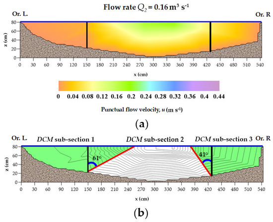 (a) Flow velocity field u (m·s−1) for the Q2 (= 0.16 m3·s−1) flow rate regime; (b) divided channel method (DCM) sub-sections. The continuous dark blue line indicates the water level at bankfull. The continuous vertical black lines indicate the boundary of the side buffers of undisturbed riparian vegetation, while the red lines represent the borders of the DCM sub-sections, in which slopes were equal to 61° and 41°, respectively referred to DCM sub-section 1 and DCM sub-section 3 (light green regions in Figure 7b). (From Lama et al. [3], modified).