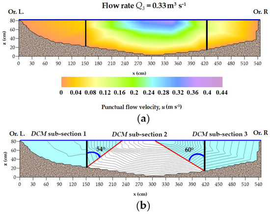 The experimental flow velocity distributions, also defined as isotachs, have been obtained by linearly interpolating the measured instantaneous flow velocities u (m·s−1) acquired at the 15 points composing the ADV cross section measuring grid [1]. The experimental isotachs corresponding to the two examined flow rates Q2 (= 0.16 m3·s−1) and Q3 (= 0.33 m3·s−1) are respectively shown in Figure 7a and Figure 8a. Three distinct sub-sections have been then defined by applying DCM, after a detailed analysis of the experimental isotachs. As shown in Figure 7b and Figure 8b, the boundaries of the three DCM sub-sections have been delineated by drawing lines orthogonal to the isotachs starting from the channel bottom. Then, the slopes of these lines have been easily determined by means of simple geometrical computations. These lines correspond to the physical interface between water flow and riparian vegetation. The momentum exchange is null through these lines.
