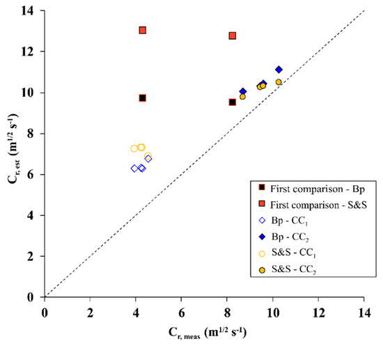 A comparative analysis between Cr,mod and Cr,meas has been carried out in order to evaluate the predictive efficiency of the Bp and the S&S flow resistance predictor models [8,9] in the condition of partial vegetation cover of a reclamation channel. As shown in the following Figure 9, a first comparison has been executed between Cr,mod and Cr,meas, the latter calculated without applying the composite section methods (indicated by filled orange and black squares). Then, by employing the methodology proposed in the present study to parametrize the effect of riparian vegetation on the actual cross sectional flow velocity distribution, a comparative analysis has been performed by applying the DCM [11] in combination with the four selected composite cross section methods: Colebatch [12], Horton [13], Pavlovskii [14], and Yen [15].