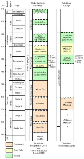 The earliest Phanerozoic deformation of the area of the Oman Mountains is the Early Cambrian Cadomian Orogeny [1]. The age of the Cadomian Orogeny postdates the Fara Formation (Figure 4). Considering U-Pb ages of zircons from volcanic layers of the Fara Formation by [20,21], the top of the Fara Formation dates as 542 Ma.