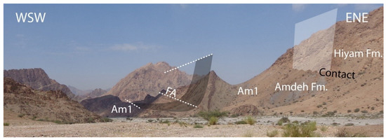 Structural and stratigraphic overview in Wadi Amdeh. To the ENE, the light transparent surface marks the contact between the Amdeh and Hiyam formations. This contact between the older Hiyam Formation and the younger Amdeh Formation is a steeply dipping fault as indicated by the dip of the light transparent surface and is described in Section 5.2 as the “Wadi Amdeh Fault”. This view shows Am 1 which displays a large open syncline (dark transparent curved surface) with a fold axis (FA) oriented (331/03). It is the largest fold we encountered. From the Wadi to the Hiyam/Amdeh contact, the beds of Am 1 become increasingly older. In the subsurface, this contact is an angular unconformity (compare [4]). Coordinates of the depicted section: 23°19′43.68″ N/58°23′37.78″ E.