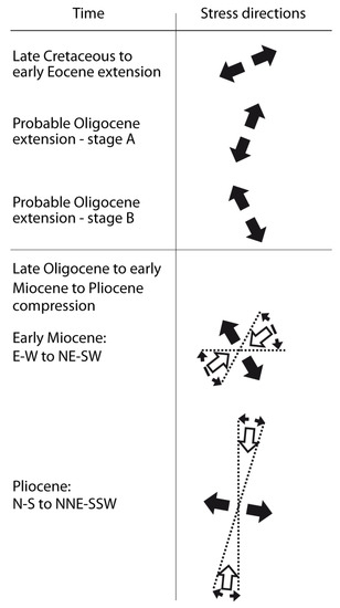 Overview of the changing Late Cretaceous to Pliocene paleostress directions of the eastern Oman Mountains, drawn after [53].