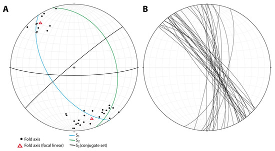 The bedding of Am 1 (S0) is (237/67). Am 1 displays three cleavage systems (Figure 7A and Figure 9). The attitude of S1 is (236/57) and, thus, similar to that of S0. S1 is a closely spaced (mm scale) slaty to schistose cleavage, displaying little orientational scatter (Figure 9A). S2 dips more gently with scattered orientations (Figure 9A,B). Their focal orientation is (070/35; Figure 7A). It is a widely spaced (up to several cm) crenulation cleavage. S3 is a fracture cleavage (spaced cleavage).