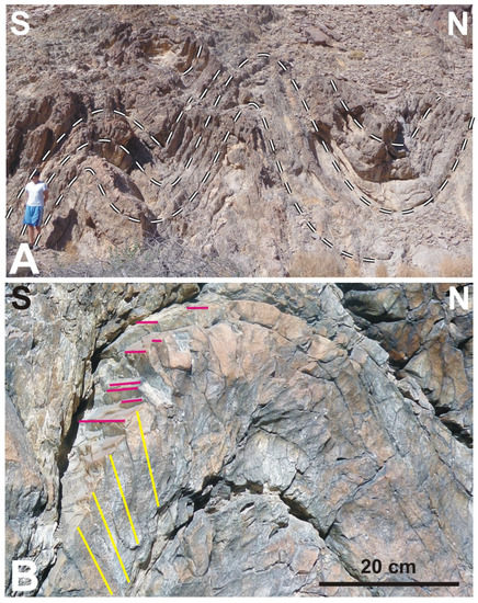 Folds in quartzites of Am 2 with thickened hinge areas and thinned limbs in Wadi Qahza. (A) Typical open folds with vertical or steeply dipping fold axial planes. The folds are clarified by white dashed lines. (B) Anticline with bedding and fold-related cleavage (S1). The steeply dipping cleavage is marked by yellow lines. The intersection lineations between bedding and cleavage (indicated by red lines) are parallel to the fold axes. Coordinates: 23°19′29.62″ N/58°22′58.52″ E.