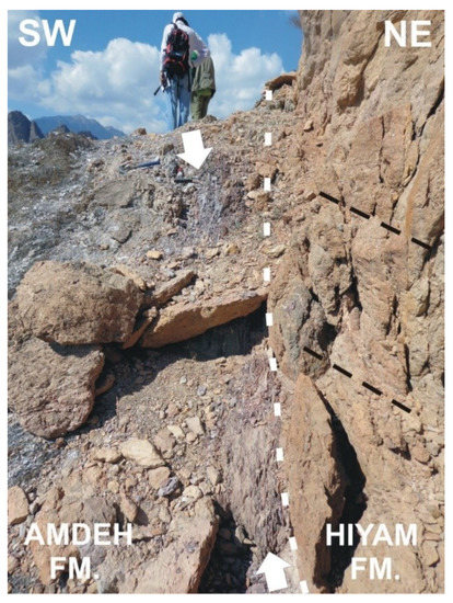 Contact between the Amdeh and Hiyam formations. The contact is marked by the sinistral Wadi Amdeh Fault (dashed white line). Note the slickenlines between the two black dashed lines. The two white arrows point to the red cataclasite/tectonic breccia in close proximity to the fault. Note that the red cataclasite/tectonic breccia is obliquely oriented to the fault, being in contact with the fault in the foreground and separated from the fault in the background. Coordinates of the fault: 23°19′ 45.12″N/58°23′43.95″ E.
