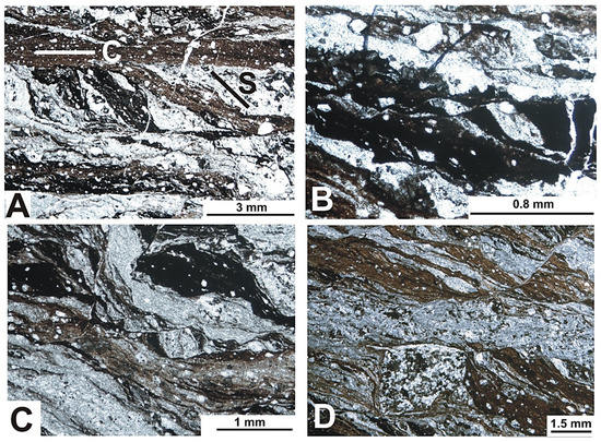 Thin section micrographs of the reddish cataclasite/tectonic breccia which formed at the brittle–ductile transition. Note the foliation and flow fabrics! (A) Foliated sample with S-C fabric. (B) Altered feldspar crystal in dark matrix, sheared into three fragments (center), which become larger to the right. Shearing ensued parallel to the foliation. Note that the fragments display size and shape match across the shear planes. The shear planes are mineralized (light surfaces in dark matrix; left shear plane is deformed). (C) Altered feldspar crystal, sheared into two fragments (center) parallel to the foliation. The fragments display size and shape match across the shear planes. (D) Large porphyroclast system with pressure shadows displaying stair-stepping geometry (center bottom). Moreover, note the probable synthetic shear plane displacing the foliation (upper right and upper center). The long sides of the micrographs are parallel to the main foliation. All PPL.