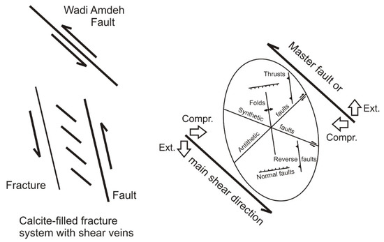 Geometric relationship between the Wadi Amdeh Fault (master fault) and the calcite-filled fracture system. Note that this system cannot be a synthetic element of a sinistral master fault if compared with a respective strain ellipse model (ellipse drawn after [61]).
