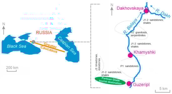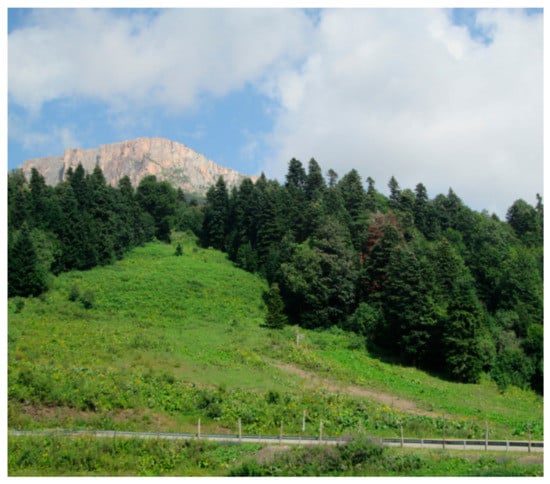 The Partisan Glade tourist destination (44°05'N, 40°10'E) is located to the west of the small town of Guzeripl in the Western Caucasus (Figure 1). The landscape is dominated by mountain ranges (Figure 2) and valleys of small rivers and streams; the elevation ranges between 600 m and 2000 m. The ranges are either symmetrical, with more or less smoothed slopes (e.g., the Inzhenernyy Range and the Skazhennyy Range), or they are asymmetrical, cuesta-type ranges, with one very gentle slope and the other a steep, cliffed slope (e.g., the Kamennoe More Range) []. The main rivers are the Zhelobnaya River and its right tributary, namely the Armyanka River. The climate is temperate. Summers are hot with temperaturesup to +30 °C and significant rainfall, winters are cold with temperatures as low as −10° and significant snowfall. The mountain slopes are covered by coniferous and mixed (coniferous–deciduous) forests. The human activities include local wood production, road maintenance, and tourism, but the visible human impact is minimal.
