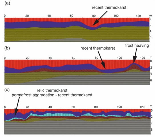 Sites with the uniform bottom of Layer A at 0.5–1 m had background values of seasonal thawing (Figure 4a), slightly deeper than that in pristine tundra nearby, likely due to different soil composition and drainage []. The thickening of Layer A up to 2–3 m accompanied by the thinning of Layer B marked taliks and, thus, indicated the active thermokarst (Figure 4a,b). The thickening of ice-rich Layer B to 1–1.5 m was associated with the aggradation of permafrost by the freezing of ground filling (Figure 4b,c). The local thickening of Layer F indicated heaving, observed at sites where the active layer reached the table of Layer F (Figure 4b). On sites where Layer B thickened to 2–2.5 m, pinching out Layers E and F (Figure 4c), the aggradation of permafrost occurred by the refreezing of a talik formed by the relic thermokarst of the marine terrace.
