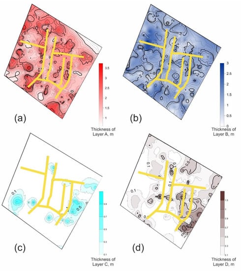 Spatial patterns of near-surface layers: (a) thickness of Layer A; (b) the bottom (isochores) and thickness (filling) of Layer B; (c) thickness of Layer E; (d) thickness of Layer F. Yellow lines show the network of streets.