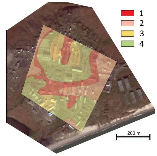 Based on the interpretation of layers and reconstruction of cryogenic processes, the built-up area of Lorino was classified by the hazard of cryogenic processes into four types (Figure 6).