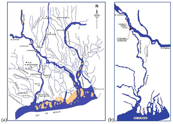 (a) Bifurcation of the Ganges River near Farakka into Padma and Bhagirathi-Hooghly, together with the location of their principal tributaries and distributaries; (b) Location of Farakka Barrage and Farakka Feeder Canal that diverts water of the Ganges to the Bhagirathi River. Modified after Parua [7].