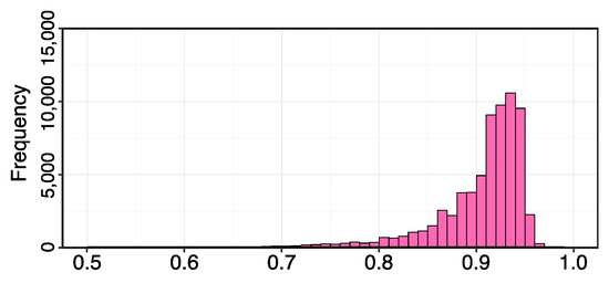 Histogram of the discrimination rates that were obtained through the exhaustive search approach (65,535 combinations). The highest frequency value was between 0.93–0.94.