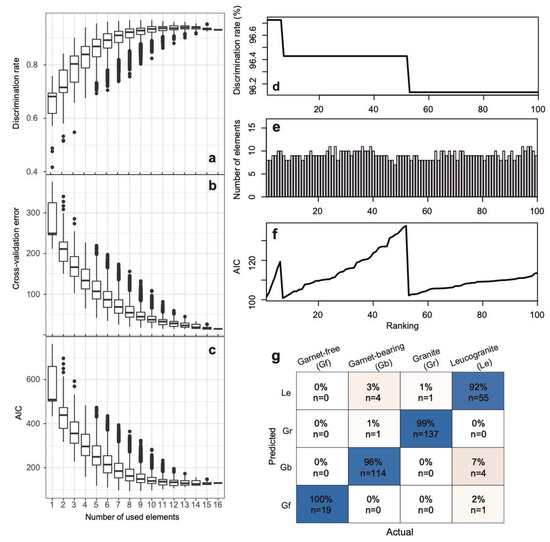 The results were first sorted by the discrimination rate and then by the AIC in Figure 2. The highest discrimination rates of ~97% were obtained when 8–10 elements were used, whereas the lowest discrimination rate was obtained when using one element (i.e., La) (Figure 2a,d). Using more elements generally yielded higher discrimination rates, and the discrimination rate decreased and the CV error and AIC increased when the number of used elements was less than six (Figure 2a–c). The discrimination rate that was obtained by using any combination of >10 elements did not exceed the rates of most discriminatory models that used 8–10 elements (Figure 2d,e), which is consistent with the discrimination performance in terms of the AIC (Figure 2c). The classification accuracy of the MLR is presented as a confusion matrix for one of the best-fitting models that used eight elements (La, Ce, Pr, Nd, Sm, Eu, Lu, and Th) (Figure 2g). All samples yielded high classification scores, although leucogranite samples tended to be erroneously classified as garnet-bearing metamorphic samples.