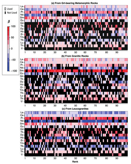 Figure 3 shows the regression coefficients for each category when the garnet-free metamorphic rock was the baseline category. The combinations of elements that yielded high discrimination rates generally included the light REEs, Eu, Th, and some heavy REEs, whereas the middle REEs and U were rarely selected in the top 100 ranks (Figure 3). Conversely, light and middle REEs tended to be excluded in the models with low discrimination rates. These features of the elemental selection were generally observed through all ranks. The regression coefficients for the middle REEs (apart from Eu) were positive, whereas those of heavy REEs were generally negative for the garnet-bearing metamorphic rocks (Figure 3a). In contrast, the regression coefficients for the granitic rocks were characterized by a significant difference between the positive Sm coefficients and the negative coefficients for its adjacent REEs (Figure 3b). The regression coefficients for the leucogranites showed both features and significant contrasts in the coefficients for the light REEs (Figure 3c).