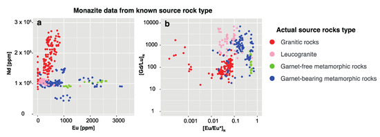 Compared to the abundance-based discrimination, however, the ratio-based discrimination classified many grains as having both garnet-free metamorphic origins and garnet-bearing origins. The discrepancy between the results of the two discrimination models is highlighted by plots of the classified source rocks for the detrital monazites as a function of Nd versus Eu abundances (Figure 6a,c) and [Gd/Lu]N versus [Eu/Eu*]N (Figure 6b,d). The detrital monazite grains with restricted Eu anomalies and heavy REE depletions were, by definition, classified as having garnet-free metamorphic rocks in the ratio-based discrimination (Figure 6d); conversely, their source rocks were mainly categorized as garnet-bearing metamorphic rocks in the abundance-based discrimination (Figure 6b). Considering that the drainage basins of these African rivers contained garnet-free metamorphic rocks [9], the paucity of monazite from garnet-free source rock in the abundance-based discrimination model may question the validity of the discrimination between garnet-free and garnet-bearing source rocks. Alternatively, this result might be interpreted as resulting from significantly low modal abundances of monazite grains in the garnet-free metamorphic rocks relative to granitic and garnet-bearing metamorphic rocks in the drainage basins.